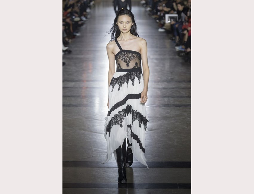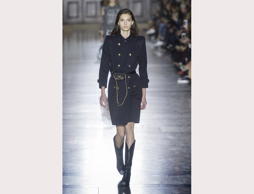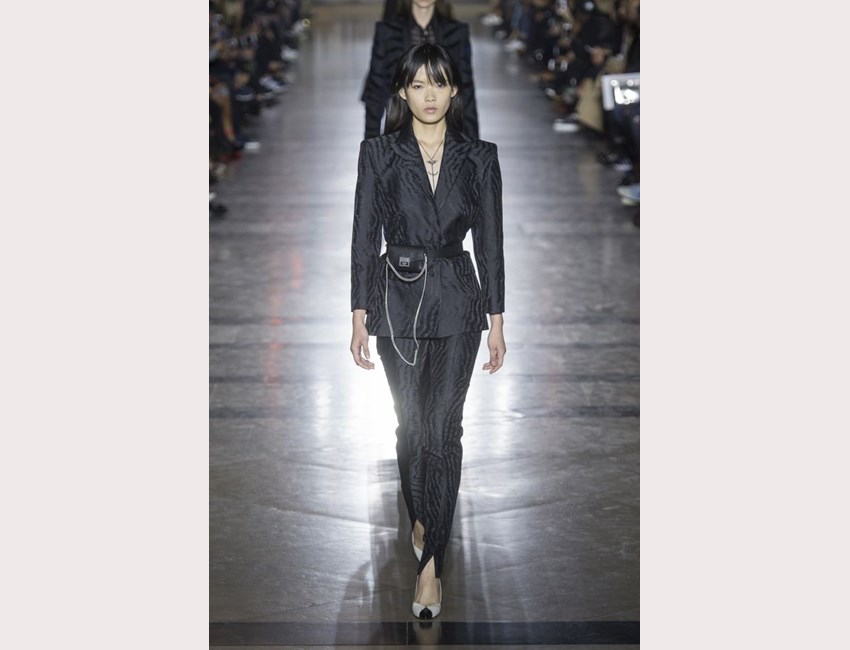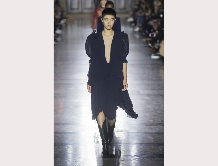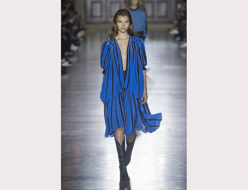 Το έργο της Clare Waight Keller ως νέας καλλιτεχνικής διευθύντριας του Givenchy δεν ήταν εύκολο, δεδομένης της ισχυρής δημιουργικής σφραγίδας που άφησε στον οίκο ο προκάτοχός της, Riccardo Tisci. Η ίδια δήλωσε ότι ανέτρεξε στα αρχεία του θρυλικού Hubert de Givenchy (και ιδρυτή του οίκου) και "κράτησε" την εμμονή του στους ώμους και τα graphic prints. Άνοιξε το show με μια double-breasted καμπαρντίνα σε σκούρο μπλε και συνέχισε με φορέματα -άλλοτε αιθέρια, άλλοτε πιο "βαριά"- με διάφορα χρώματα και prints. Η παλέτα της κινήθηκε μεταξύ του μπλε, του λευκού και του μαύρου με εξαιρετικά ενδιαφέροντα "διαλείμματα" για κομμάτια σε έντονο κόκκινο και mint και οι μπότες της με V σχήμα στην κορυφή και ασημένια επένδυση στο μπροστινό μέρος έκλεψαν τις εντυπώσεις. Ο απόλυτος πρωταγωνιστής, παρέμεινε το φόρεμα στις διάφορες εκδοχές του- ιδιαίτερα οι βραδινές δημιουργίες της Keller που θα μπορούσες να φανταστείς στο red carpet αλλά και σε ένα πιο elevated cocktail πάρτυ.