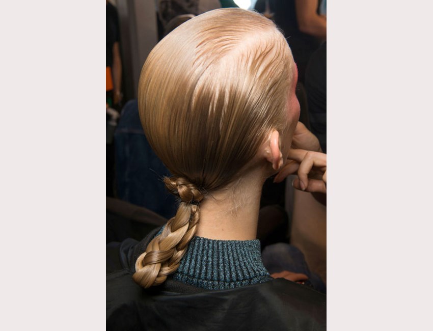 Στον οίκο Kenzo, οι hairstylists έδειξαν μια γυριστή πλεξίδα υπό τη μορφή σινιόν.