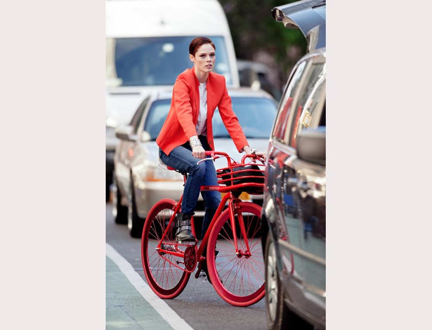 Η Coco Rocha συνδυάζει την απόχρωση του ποδηλάτου της με το blazer.