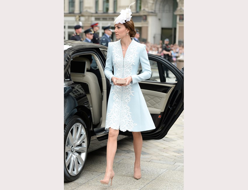 Το γαλάζιο, Catherine Walker φόρεμα αξίας $3.957 που φόρεσε στην τελετή για τα 90α γενέθλια της Βασίλισσας Ελισάβετ στις 10 Ιουνίου.