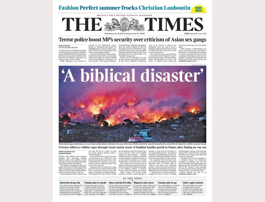Τα εξώφυλλα των εφημερίδων απεικονίζουν τις τεράστιες φλόγες ενώ τα δημοσιεύματα αναφέρονται σε ''βιβλική καταστροφή''.