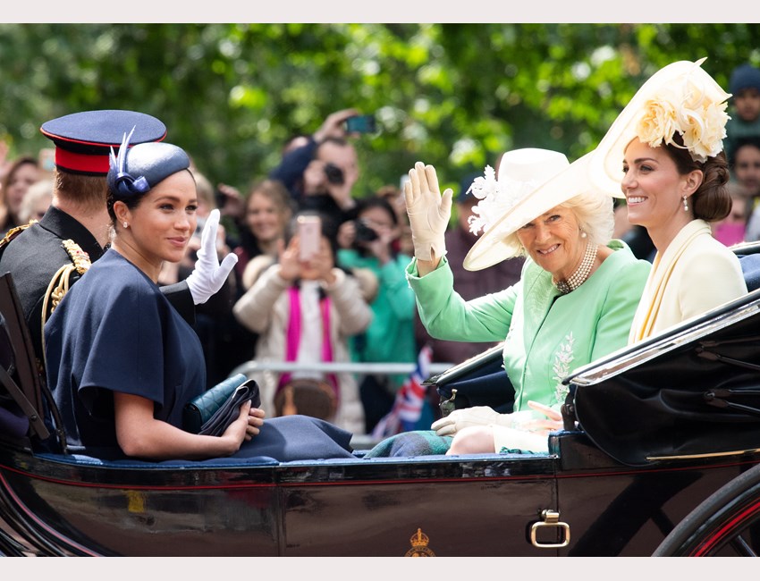 Αν και είναι μία ημέρα προς τιμήν της βασίλισσας Ελισάβετ όλα τα φώτα ήταν στραμμένα στην Meghan Markle η οποία έκανε την πρώτη επίσημη εμφάνιση ένα μήνα μετά την γέννηση του Archie Harrison. Η δούκισσα του Sussex επέλεξε ένα total navy look Givenchy με ασορτί headpiece. Τα μαλλιά της ήταν πιασμένα σε ένα κομψό σινιόν ενώ το look της συμπληρώθηκε με ένα δερμάτινο clutch bag και διαμαντένια σκουλαρίκια.