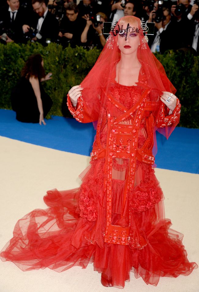 Πιστή στην παράδοση των εκκεντρικών εμφανίσεων στο θεσμό, η Katy Perry -που ήταν φέτος μια από τους οικοδεσπότες τις βραδιάς- δίχασε τους πάντες με το κόκκινο, τούλινο φόρεμα Maison Margiela by John Galliano. Τα αρνητικά σχόλια έκαναν λόγο για υπερβολή, ενώ το τούλινο πέπλο που κάλυπτε το κεφάλι της με βαριά κεντήματα θεωρήθκε αχρείαστο