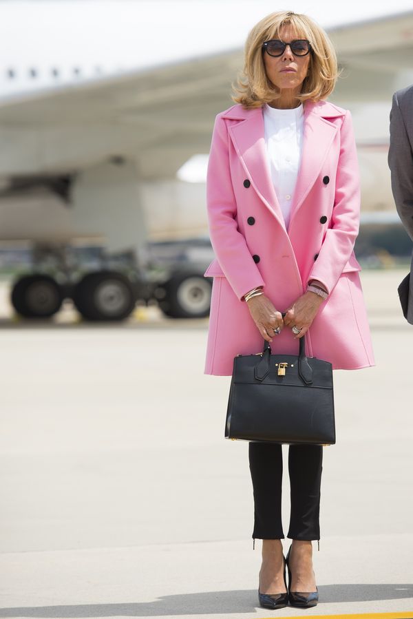 Για την άφιξή της στην Ουάσινγκτον, η Brigitte επέλεξε ροζ παλτό Louis Vuitton, μαύρο skinny παντελόνι και λευκό πουκάμισο