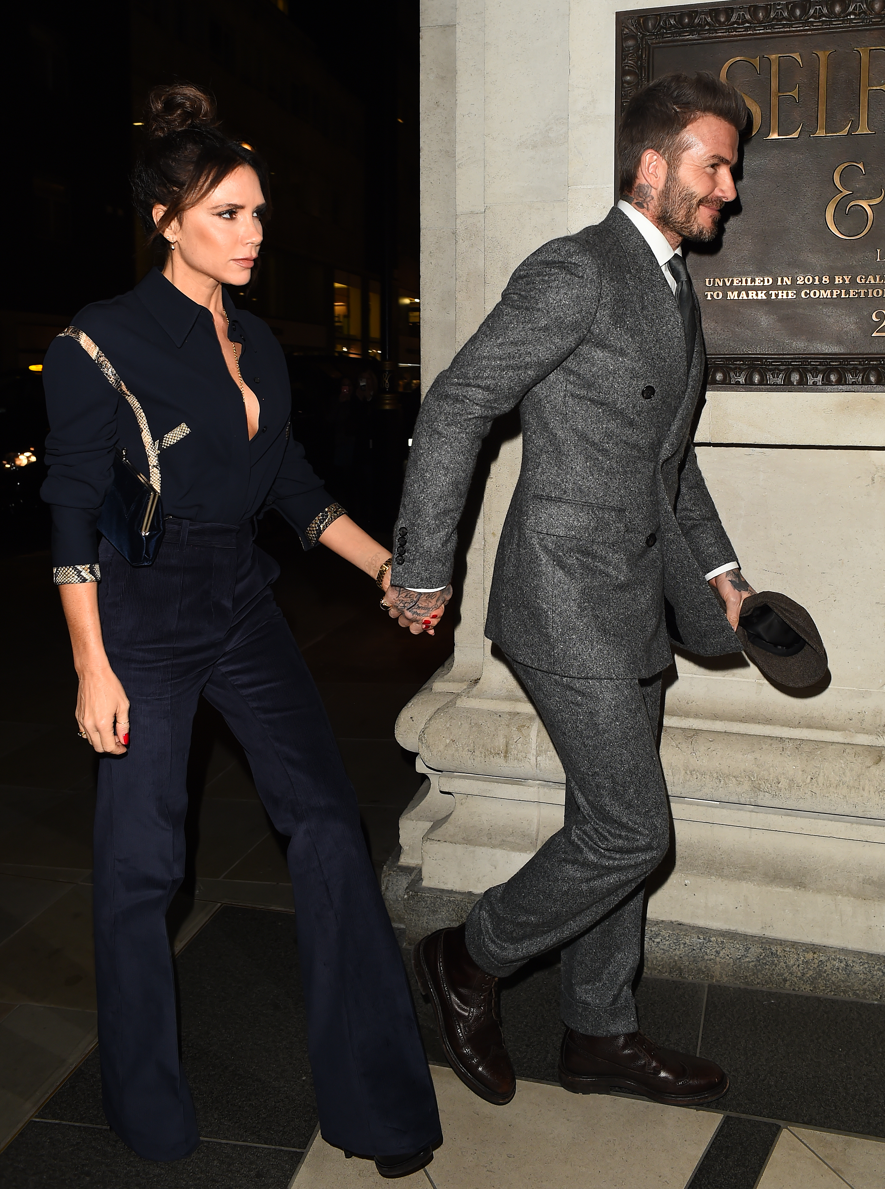 Η Victoria επέλεξε ένα υπέροχο παντελόνι σε βελούδινο ύφασμα και σκούρο μπλε χρώμα από την P/F 19 συλλογή της, το οποίο συνδύασε με μεταξωτό πουκάμισο με snake skin λεπτομέρειες. Η chic εμφάνιση ολοκληρώθηκε με μαύρα μποτάκια και βελούδινο clutch bag.