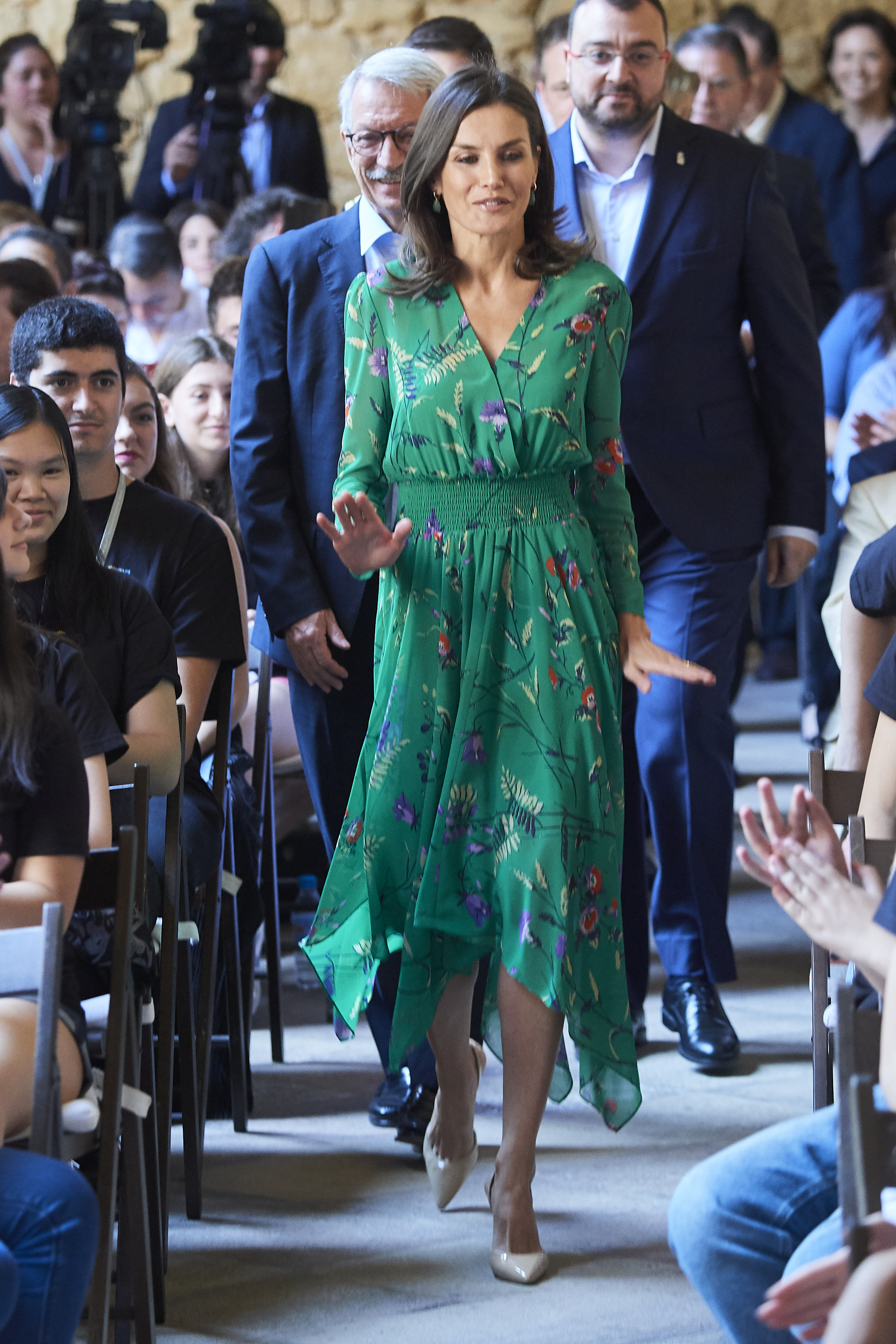 Για ακόμη μία φορά η βασίλισσα Letizia παρέδωσε μαθήματα κομψότητας. Για αυτή την εμφάνιση επέλεξε ένα πράσινο φλοράλ φόρεμα από το brand Maze το οποίο συνδύασε με nude γόβες Prada.