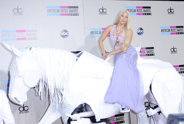 H Lady Gaga, πιστή στις εκκεντρικές εμφανίσεις, κατέφθασε στο Nokia Theatre πάνω σε ένα αυτοσχέδιο, ολόλευκο άλογο.