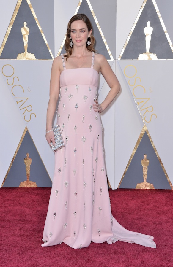 H Emily Blunt με δημιουργία Prada, κοσμήματα Niwaka jewelry, παπούτσια Sophia Webster και clutch Judith Leiber clutch.
