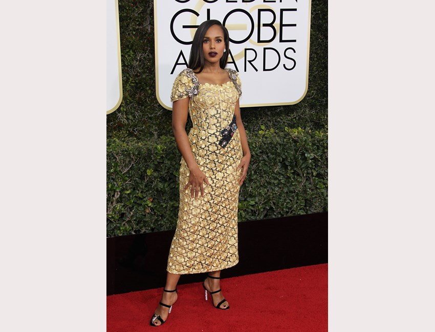 Η Kerry Washington εντυπωσίασε τόσο για τα Sophia Webster πέδιλά της, όσο για το σκούρο κραγιόν της στο χρώμα του δαμάσκηνου που επιμελήθηκε η Carola Gonzales συνδυάζοντας το Neutrogena Moisture Smooth Color Stick in Deep Plum με το Glam 355 lipstick των Dolce & Gabbana.