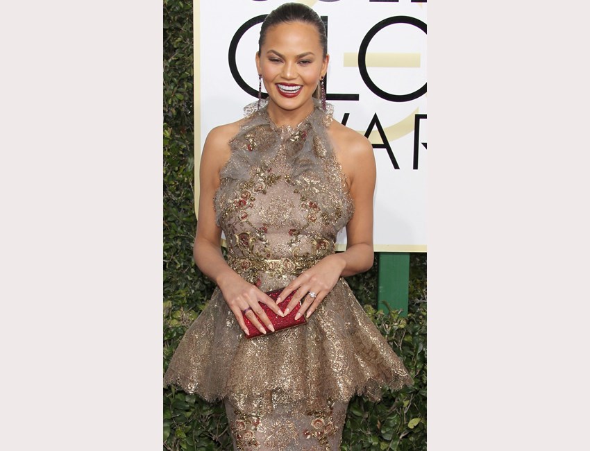 Η Chrissy Teighen φόρεσε Marchesa και το συνδύασε με ένα bronze μεταλλικό clutch και κοσμήματα Lorraine Schwartz.