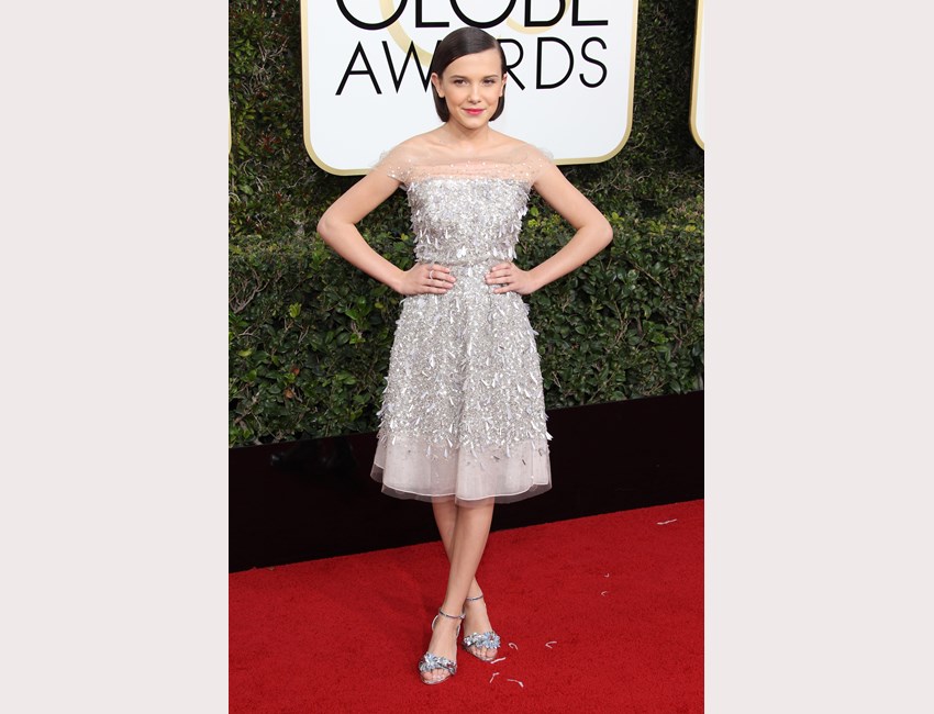 Η Millie Bobby Brown ολοκλήρωσε την εμφάνισή της με ασημένια παπούτσια Sofia Webster.