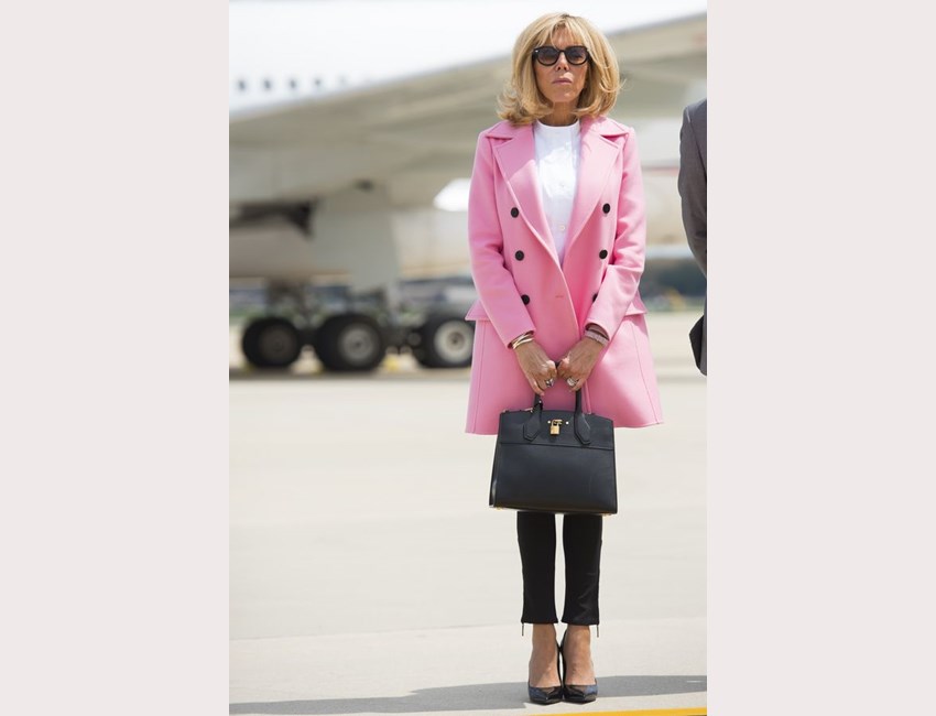 Για την άφιξή της στην Ουάσινγκτον, η Brigitte επέλεξε ροζ παλτό Louis Vuitton, μαύρο skinny παντελόνι και λευκό πουκάμισο