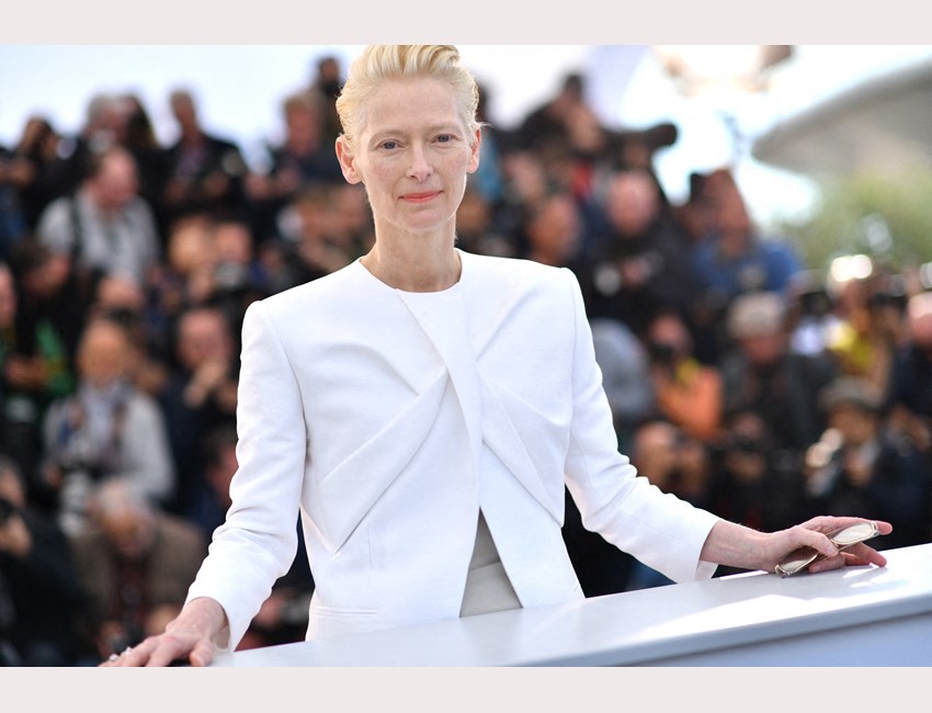 Η Tilda Swinton με ολόσωμη φόρμα και λευκό σακάκι Haider Ackermann