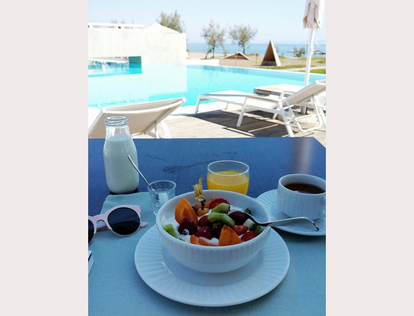 Ένα μπουκάλι φρέσκο γάλα, φρούτα με γιαούρτι και φυσικό χυμό, αποτελούν το ιδανικό κλείσιμο μετά τα scrambled eggs με μπέικον στο Thalatta Seaside Hotel.