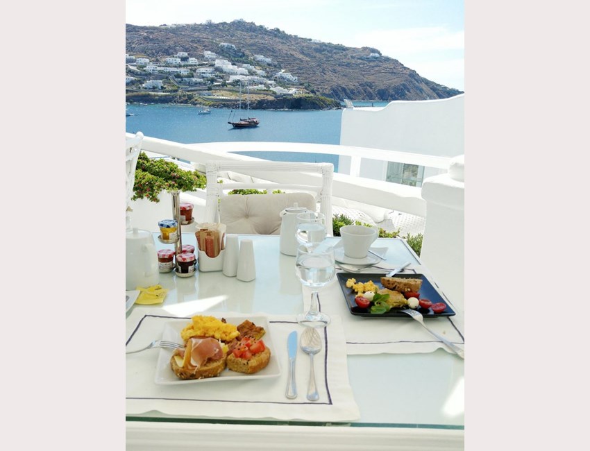 Στον Όρνο, έναν από τους ομορφότερους κόλπους της Μυκόνου, το Hotel Kivotos προσφέρει ένα νόστιμο πρωινό που συνδυάζει κλασικά πιάτα με παραδοσιακά μυκονιάτικα προϊόντα.