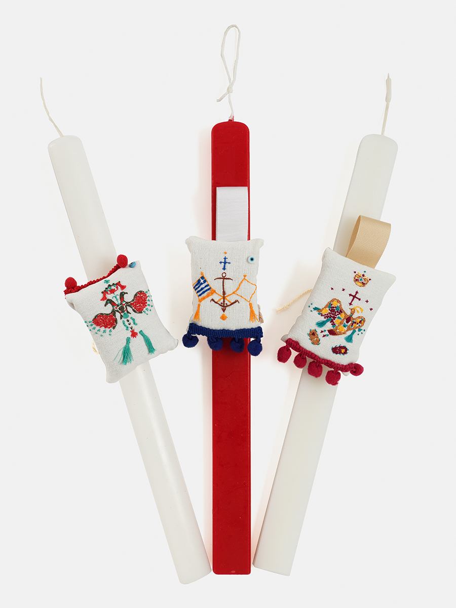 Λαμπάδα διακοσμημένη με κεντημένο στο χέρι μαξιλαράκι λεβάντας της Ηρώς Σακαρέλου, σε σχέδια εμπνευσμένα από τη συλλογή κεντημάτων του Μουσείου, Μουσείο Μπενάκη