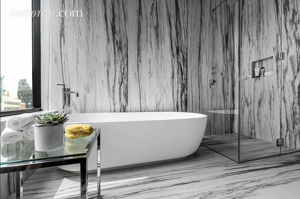 Το μάρμαρο κυριαρχεί στο μπάνιο και προσδίδει πολυτέλεια.
