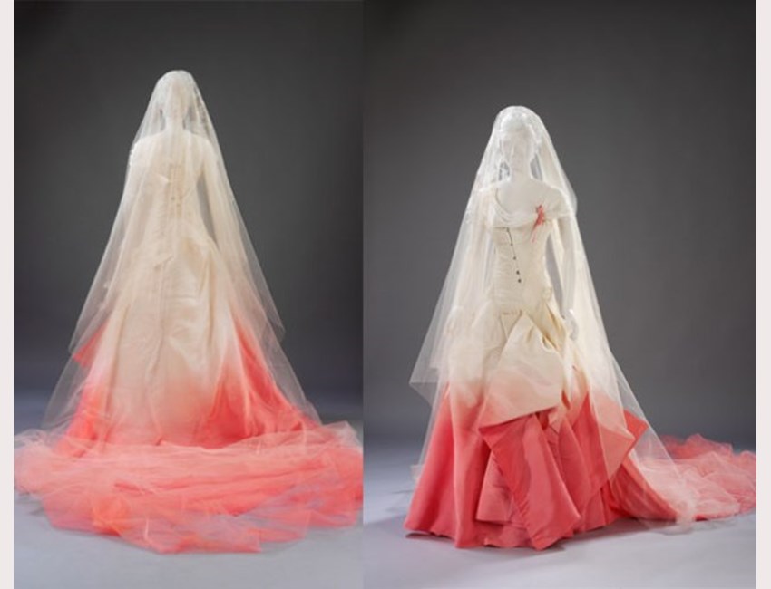 Για το νυφικό της πριγκίπισσας της pop και γνωστής trendsetter, Gwen Stefani, επιστρατεύθηκε το δημιουργικό πνεύμα του John Galliano. Η ροζ και λευκή δημιουργία σχεδιάστηκε όσο ο Galliano αποτελούσε μέρος του δυναμικού του οίκου Dior. Το νυφικό ξεχώρισε, εκτός από το ιδιαίτερο χρώμα του, και για το βέλο που φτιάχτηκε από antique lace, επιμελημένο κι αυτό από το σχεδιαστή.