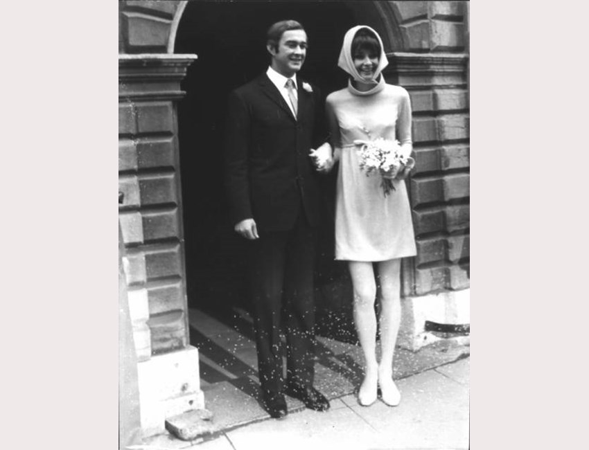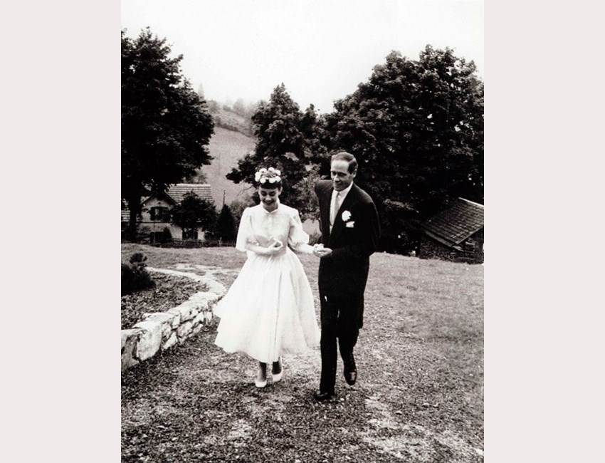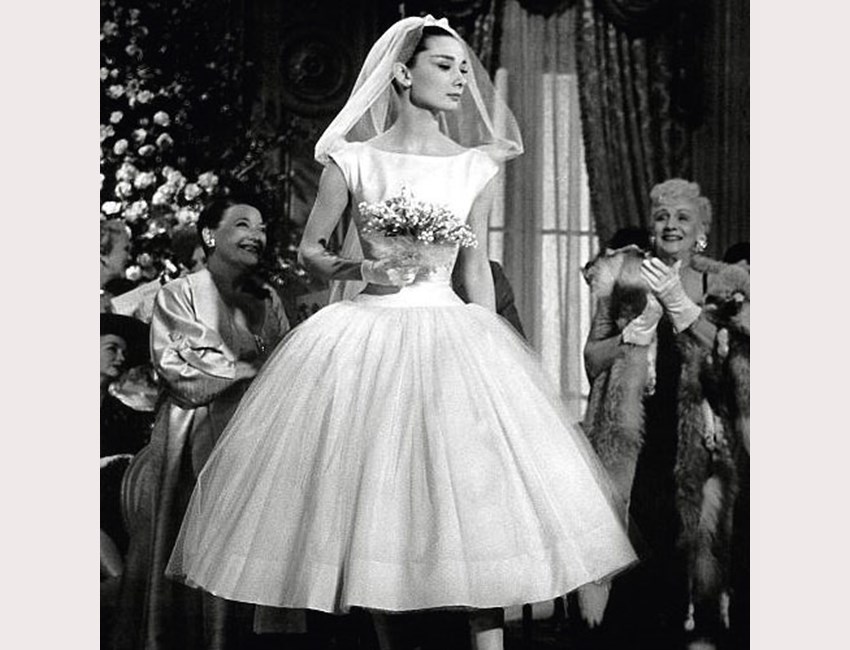 Στον πρώτο της γάμο με τον Mel Ferrer, η Audrey Hepburn φόρεσε νυφικό του οίκου Balmain, το οποίο προκάλεσε αίσθηση με την tea- length φούστα και τα μεγάλα σιφόν μανίκια. To θηλυκό look συμπλήρωνε η τιάρα από λουλούδια.