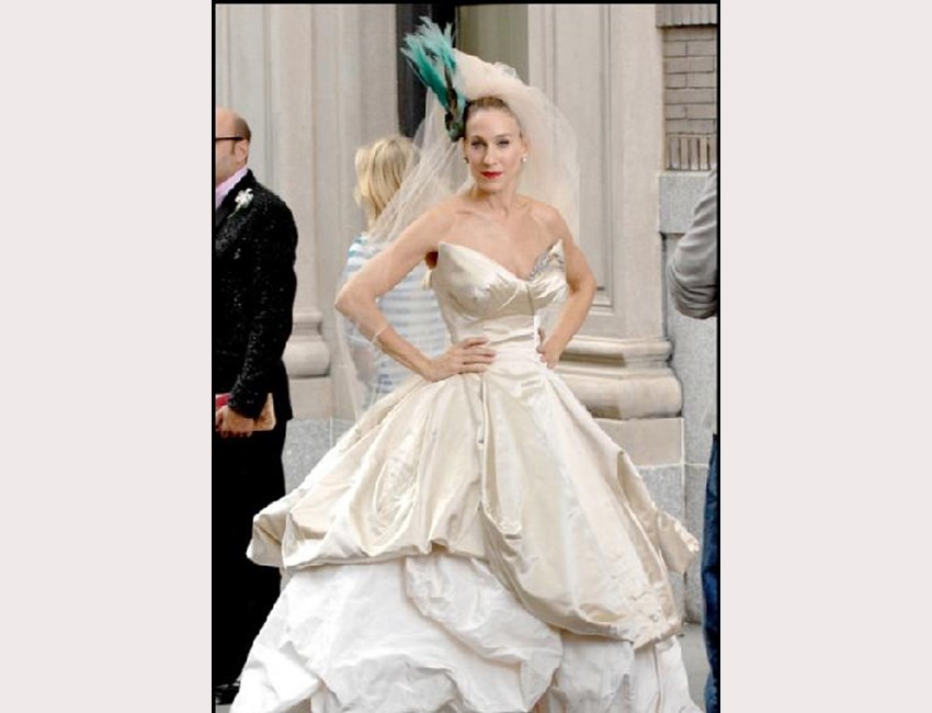 Η κινηματογραφική μεταφορά της πολυαγαπημένης σειράς 'Sex and the City' έγραψε ιστορία και σίγουρα η πιο αξιομνημόνευτη στιγμή ήταν εκείνη που η Carrie εμφανίστηκε λαμπερή μέσα στο Vivienne Westwood νυφικό της. Ξεχωρίζει με το σαμπανιζέ χρώμα του, το εξαιρετικής ποιότητας μεταξωτό σατέν ύφασμα που χρησιμοποιήθηκε για να φτιαχτεί, τις ασυμμετρίες και την ογκώδη φούστα. Η Patricia Field αναβάθμισε στιλιστικά το φόρεμα συνδυάζοντάς το με το μπλε πουλί - αξεσουάρ μαλλιών και το έντονο κόκκινο κραγιόν.