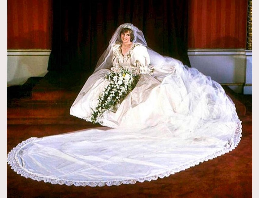 Οι σχεδιαστές David και Elizabeth Emanuel είναι υπεύθυνοι για το elegant νυφικό της πριγκίπισσας Diana, μια δημιουργία που απέπνεε 'wild romance', αλλά με το παραμυθένιο στοιχείο να είναι διάχυτο. Φτιαγμένο από μεταξωτό ταφτά, εντυπωσίασε με τα επιβλητικά μεγάλα μανίκια του και τόνιζε την ιδιαίτερα λεπτή μέση της πριγκίπισσας, ενώ λέγεται ότι χρησιμοποιήθηκαν 10.000 πέρλες, παλιά δαντέλα και οι πούλιες κεντήθηκαν όλες στο χέρι προκειμένου να στολίσουν περίτεχνα το όμορφο φόρεμα. Αξιομνημόνευτη, ωστόσο παραμένει η μακριά ουρά του φορέματος που κάλυψε μεγάλο μέρος του καθεδρικού ναού του Αγίου Παύλου στο Λονδίνο.