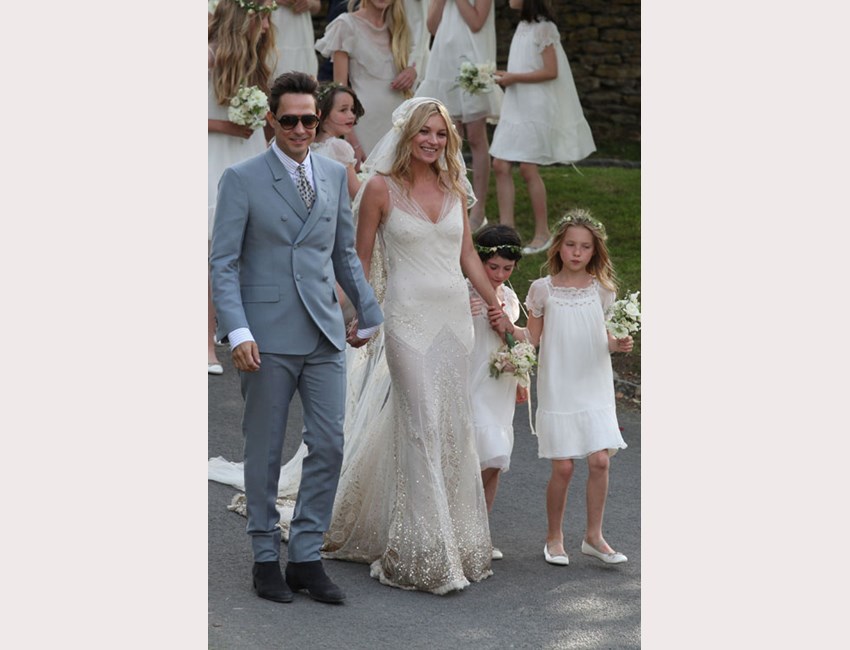 Το χρυσό κορίτσι του modeling τον Ιούλιο του 2011 παντρεύτηκε τον αγαπημένο της, Jamie Hince, φορώντας νυφικό δια χειρός John Galliano. Το vintage-style, σε κρεμ απόχρωση, νυφικό με το εξίσου εντυπωσιακό βέλο που συμπλήρωνε την bohemian δημιουργία, έδωσε μια ρομαντική πινελιά στον ήδη ξεχωριστής αισθητικής γάμο. Η αιθέρια Kate Moss έδειχνε πιο όμορφη από ποτέ και το φόρεμά της πέρασε στην ιστορία, όπως εξάλλου κι ο παραμυθένιος γάμος της.