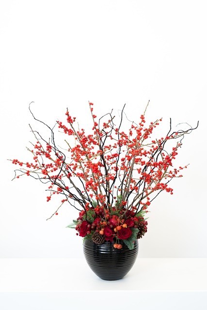 Κόκκινα ίλεξ, τριαντάφυλλα και κουκουνάρια αποτελούν μια γιορτινή σύνθεση που θα ομορφύνει ακόμα περισσότερο το σαλόνι σου. (Petridis)