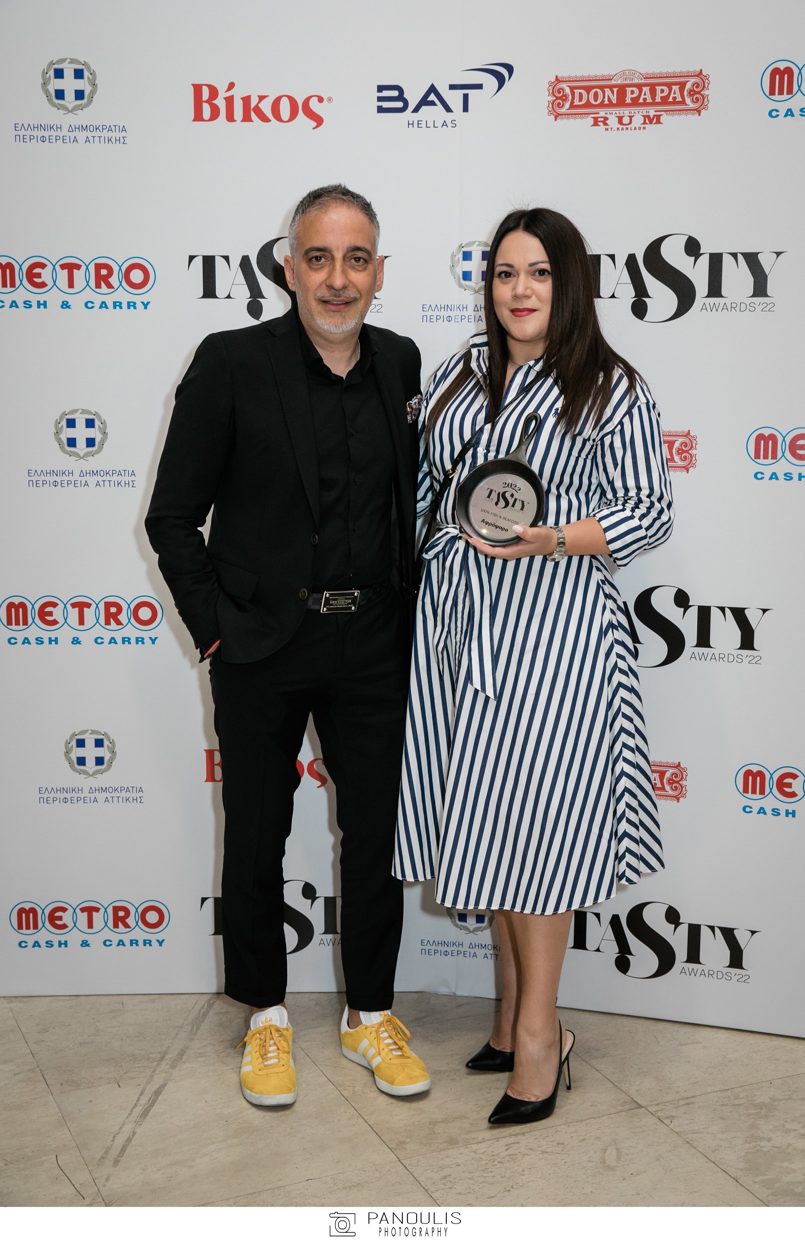 Γιούλη Αποστολίδη και Βάκης Κασβίκης με το βραβείο της κατηγορίας 100% Fish & Seafood για το εστιατόριο Αφρόψαρο