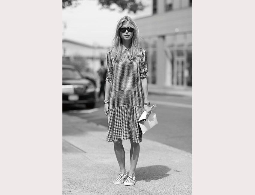 Total black & white σύνολο, με checked φόρεμα και skater shoes.