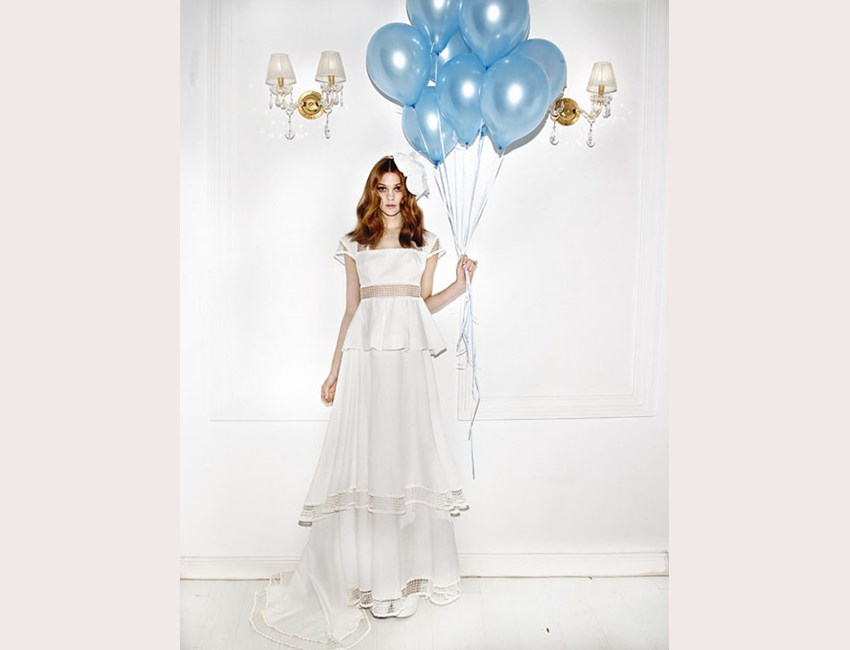 ANIA: Νυφικό ντεπιές από βαμβάκι, πλατφόρμες και στέκα, IOANNA KOURBELA. Δαχτυλίδια, LINKS OF LONDON.
