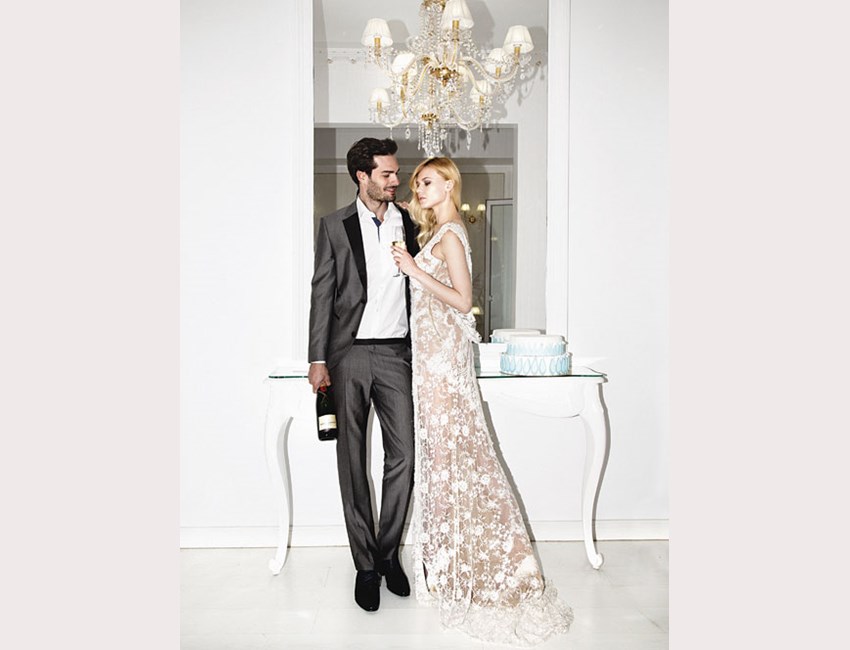 ALICJIA R: Νυφικό φόρεμα από ολοκέντητη δαντέλα, CELIA KRITHARIOTI-HAUTE COUTURE. Τούρτα, FRESH. Σαμπάνια, Moet & Chandon Imperial.