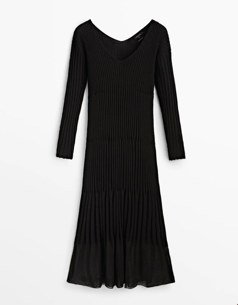 Μαύρο μακρύ φόρεμα ριμπ με λαιμόκοψη V Massimo Dutti