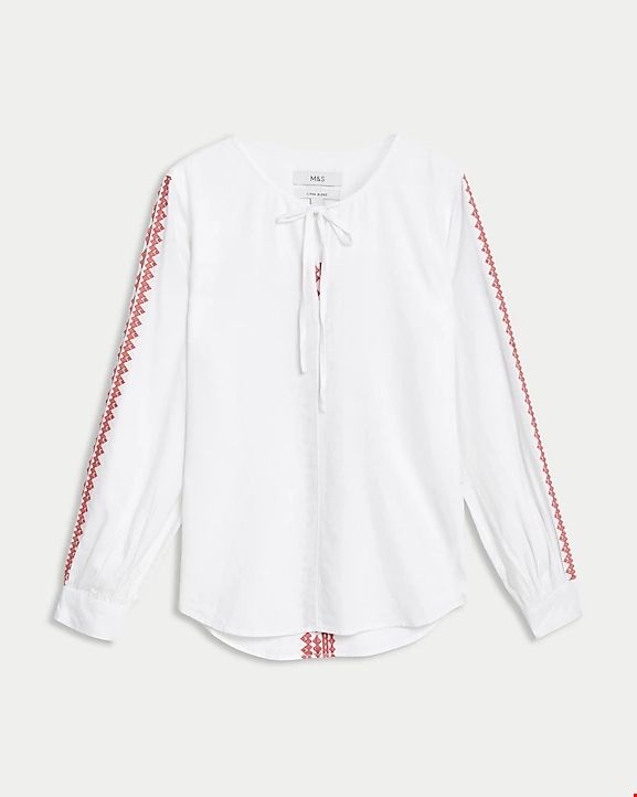 Κεντητή μπλούζα με δέσιμο στη λαιμόκοψη από σύμμεικτο λινό Marks & Spencer