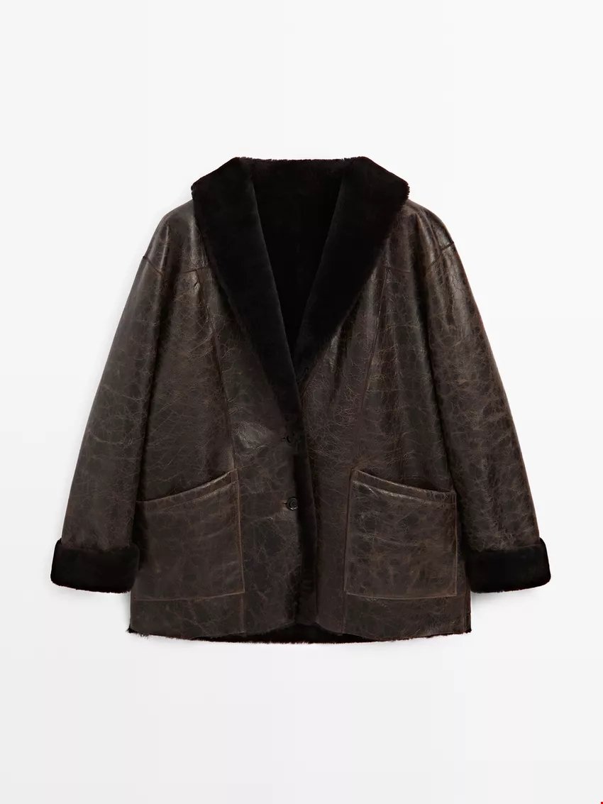 Παλτό από μουτόν και δέρμα με κρακελέ φινίρισμα Massimo Dutti