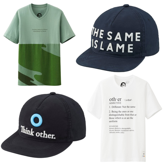 Περιλαμβάνει λοιπόν, γυναικεία και αντρικά T-shirts και καπέλα σε 14 διαφορετικά χρώματα με τα σλόγκαν ''Think Other'' και ''THE SAME IS LAME'' τυπωμένα πάνω τους.