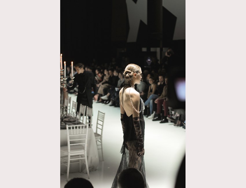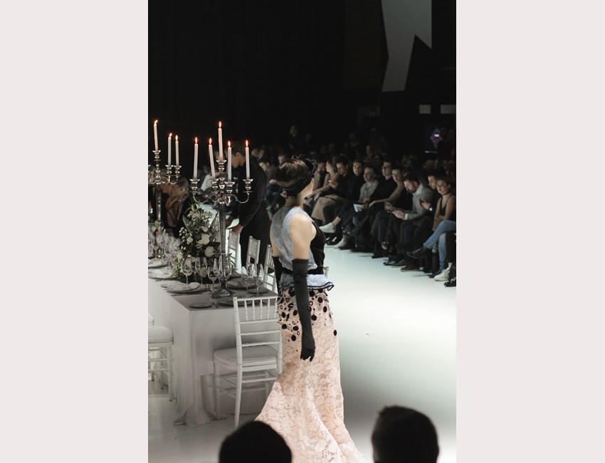 Όσο κι αν η ατμόσφαιρα μας προϊδέαζε με το που φτάσαμε στο παλαιό Λιθογραφείο της καπνοβιομηχανίας, σε ένα στενάκι πάνω από το λιμάνι, γεμάτο βιομηχανικά κτίρια που έδειχναν ή ήταν εγκαταλελειμμένα, συνεργεία και παλιά, χαμηλά σπίτια με τη φθορά του χρόνου εμφανή πάνω τους, δεν ήμασταν έτοιμοι γι' αυτό που θα εκτυλισσόταν σε λίγη ώρα μπροστά στα μάτια μας. Μπαίνοντας στον χώρο συνηθίσαμε εύκολα την βαθιά πορτοκαλί απόχρωση του φωτισμού και ξεχωρίσαμε κατευθείαν το τεράστιο, στρωμένο τραπέζι με τα κηροπήγια- μανουάλια, που δέσποζε στην μέση της αίθουσας. Κι αν, όλες αυτές οι λεπτομέρειες δεν φαίνονται σημαντικές, νιώθω την ανάγκη να αναφέρω ότι, στην Αθήνα του 2016 –και δη στον χώρο της μόδας- μία παραγωγή τόσο καλά στημένη δεν μπορεί παρά να σε προϊδεάσει ότι κάτι σημαντικό θα συμβεί.