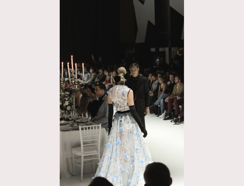 Το τέλος της εντυπωσιακής παρουσίασης ήρθε με την έλευση και του τελευταίου μοντέλου στο catwalk και την τοποθέτησή του στο μακρύ τραπέζι. Εκεί, η μουσική σταμάτησε απότομα, ο σχεδιαστής βγήκε για να κάνει τη σύντομη υπόκλισή του και το κοινό έμεινε να χειροκροτά εμβρόντητο τους πρωταγωνιστές αυτής της βραδιάς που άνοιξαν ένα παράθυρο σε έναν κόσμο διαφορετικό- έναν κόσμο όπου η σταθερότητα, η λογική, η ιεράρχηση και η καλαισθησία παίζουν πρωταγωνιστικό ρόλο.