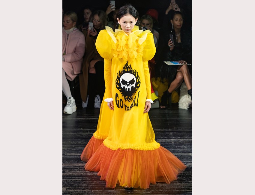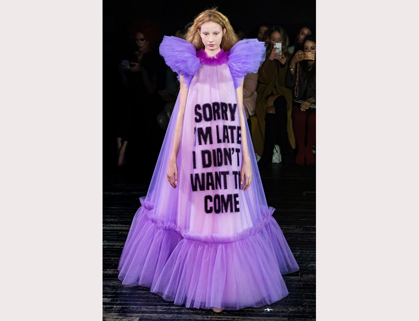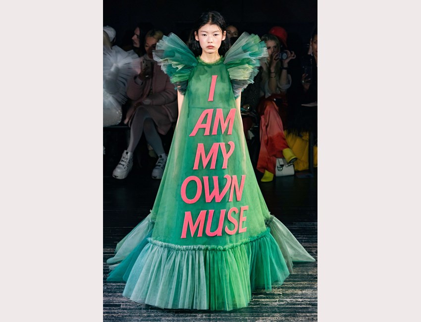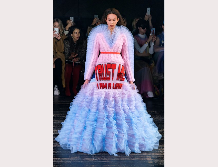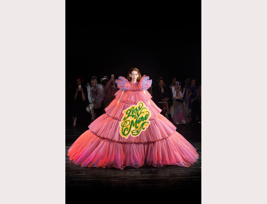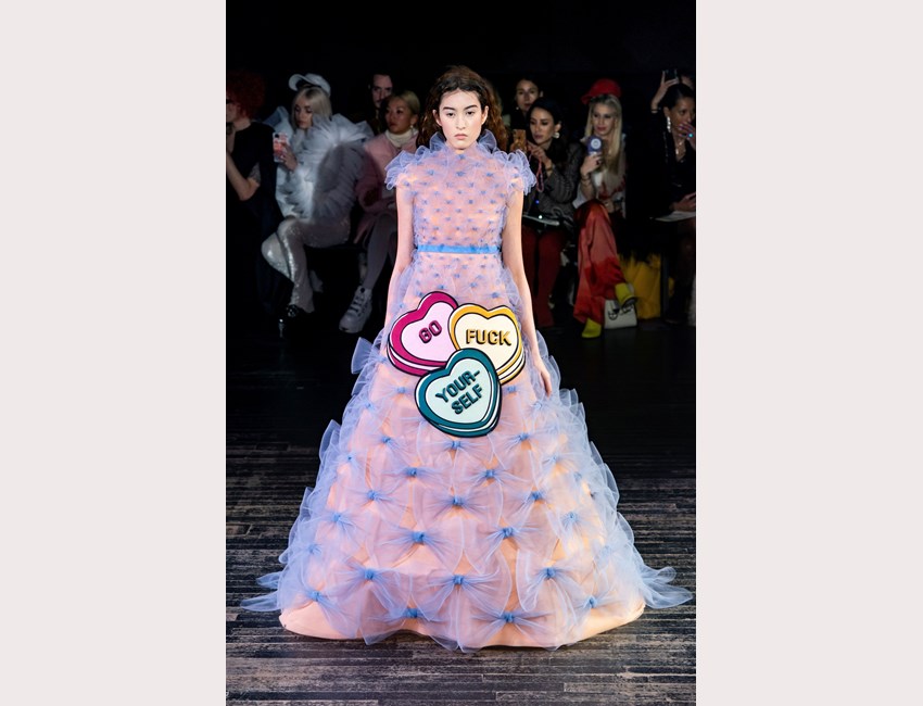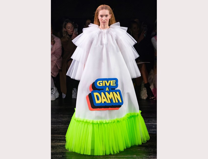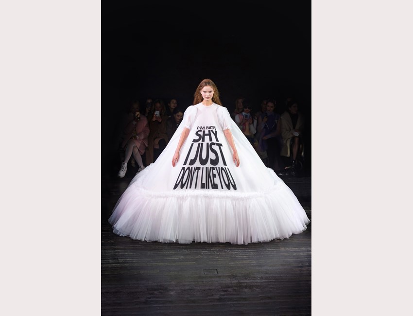 Κάπως έτσι, στις μέρες του #metoo όπου τα red carpets αποτελούν πεδίο διαμαρτυρίας, ο Viktor & Rolf αποφάσισε οι παραμυθένιες δημιουργίες του να εισέλθουν δυναμικά στο νέο κίνημα, περνώντας το δικό τους μήνυμα. Τεράστια logos, λοιπόν, κόσμησαν τις τούλινες υπερπαραγωγές με τα μηνύματα να μιλούν απευθείας στο μυαλό του κοινού και να αναπαράγoνται με τεράστια ταχύτητα στα social media με αποτέλεσμα να γίνουν viral μέσα σε μία νύχτα.