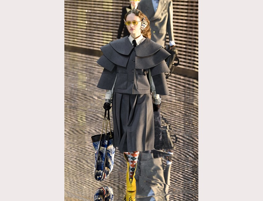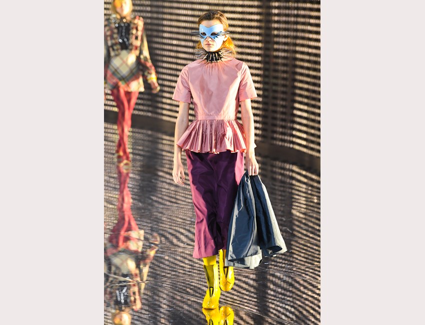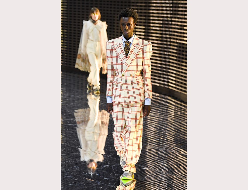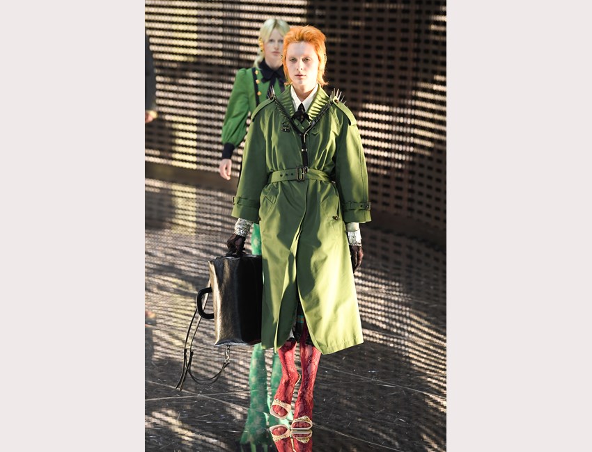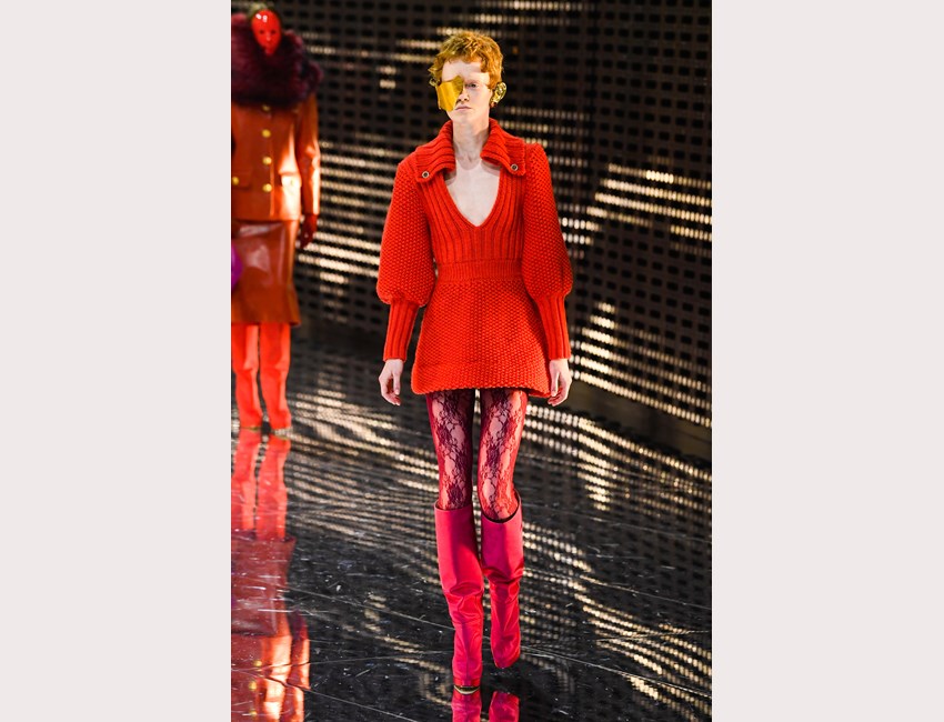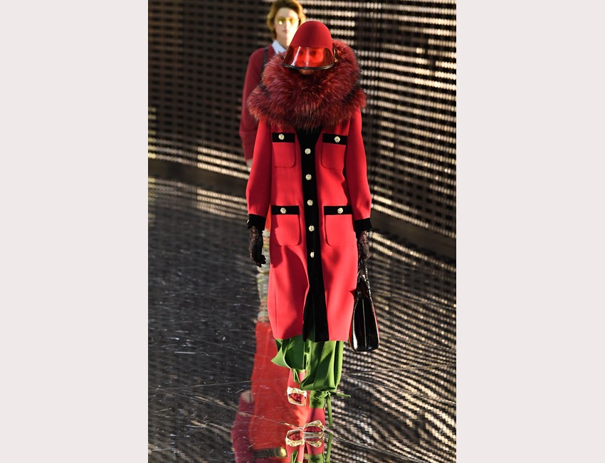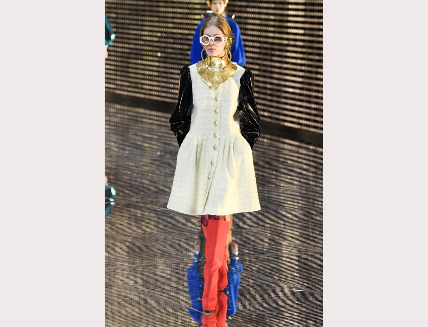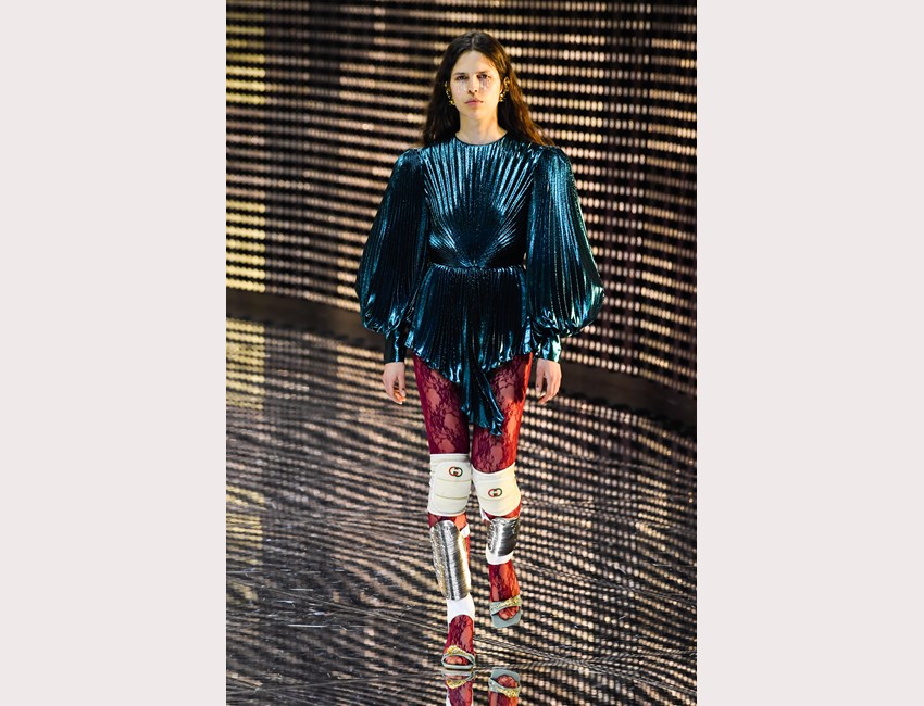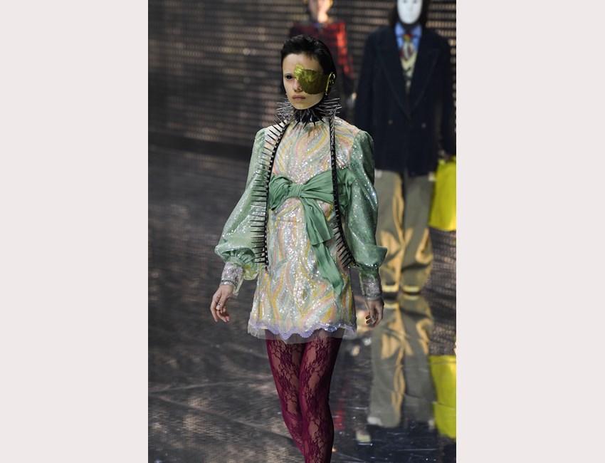 Για να είμαστε αντικειμενικοί βέβαια, μπορεί το venue να έκανε τη διαφορά, μιας και από ένα παλιό θέατρο (την περασμένη σεζόν στο Παρίσι) μεταφερθήκαμε σε ένα high tech σκηνικό, η ίδια η συλλογή όμως δεν ήταν κάτι το τρομερά διαφορετικό. Αυτή τη φορά βέβαια τα 1980s δεν ήταν η δεκαετία-πρωταγωνιστής της συλλογής του. Δεν είδαμε έντονους power shoulders, παρά τα μαξιμαλιστικά, mix'n'match στοιχεία. Είδαμε όμως γιακάδες που θύμιζαν ruff του 17ου αιώνα, καθώς και dog collars με spikes. Ρομαντισμός και kinky στοιχεία που έρχονταν και αυτά σε αντίθεση και δημιουργούσαν ένα αποτέλεσμα με περίεργη αρμονία, είχαν ακριβώς αυτόν τον στόχο, να δείξουν ότι μέσα από τα ρούχα, μπορεί κανείς να είναι χαλαρός και άνετος αλλά να έχει ταυτόχρονα μια πιο επιθετική στάση. Οξύμωρο; Για τον Gucci του Alessandro Michele γίνεται και τελικά αυτό ακριβώς είναι το συναίσθημα που προκαλούν οι εικόνες από τη συγκεκριμένη πασαρέλα.