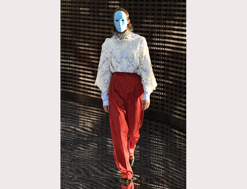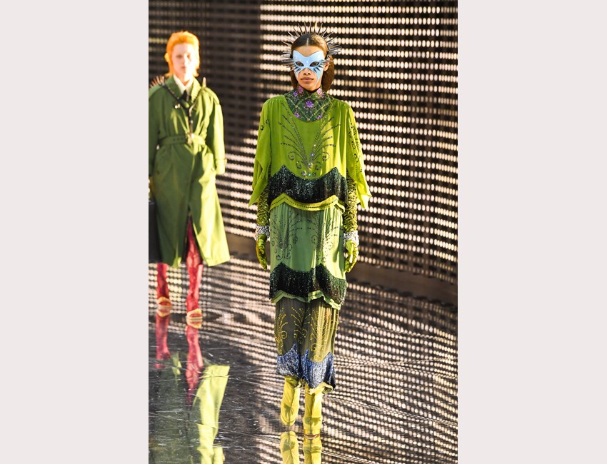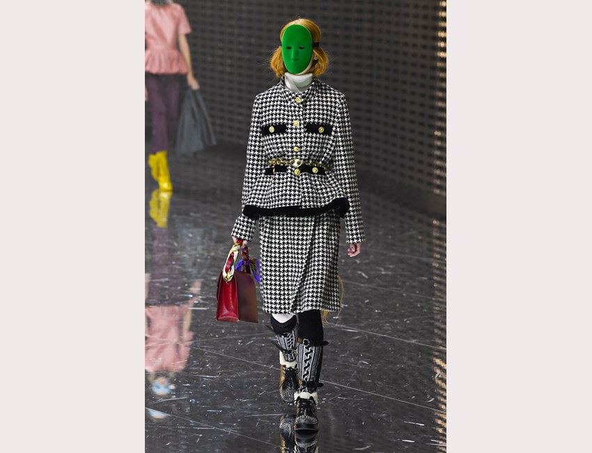 Ας ξεκινήσουμε από τις μάσκες. Φαίνεται ότι ο Alessandro Michele για κάποιο λόγο έχει έναν περίεργο έρωτα με τις μάσκες. Ίσως γιατί έχουν διπλό ρόλο, τραβούν την προσοχή με έναν τρόπο, αλλά ταυτόχρονα μπορούν να σε κρύψουν από τα αδιάκριτα βλέμματα. Αυτή η αντίθεση έχει ιδιαίτερη ενδιαφέρον και σε συνδυασμό με τα χιλιάδες LED λαμπάκια στο σκηνικό που έστησε για τον Gucci ο ευρηματικός σχεδιαστής, ήταν και μη αναμενόμενο αλλά και κάτι παραπάνω από εντυπωσιακό.
