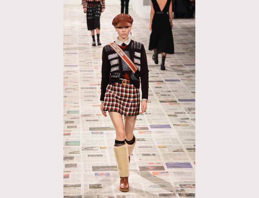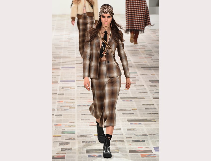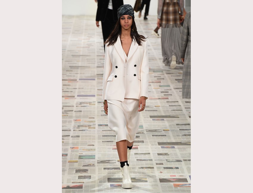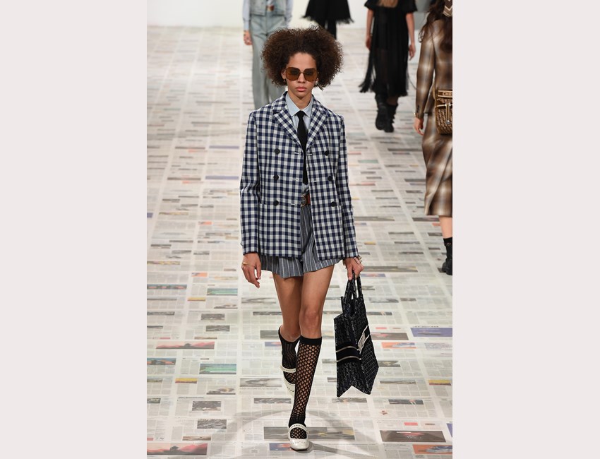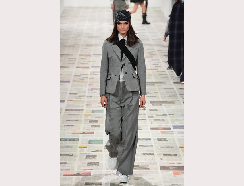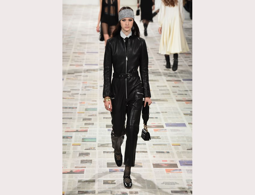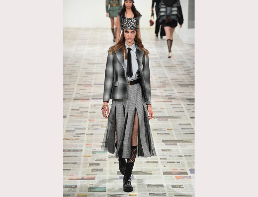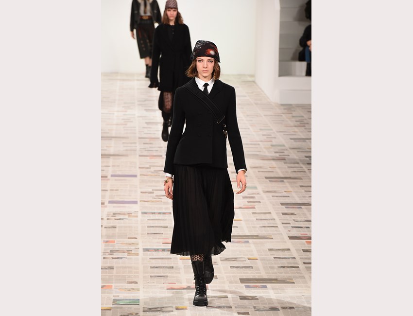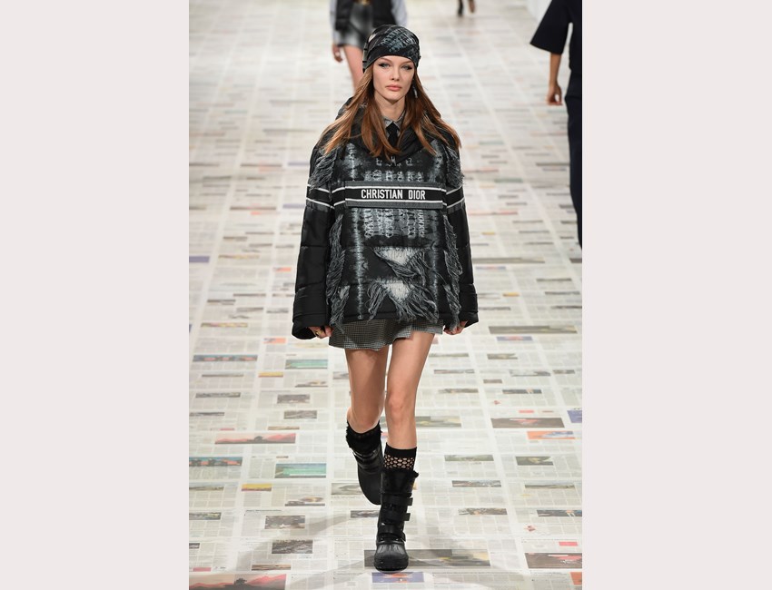 Το show της αυτή τη φορά ξεκίνησε με ένα μαύρο pantsuit το οποίο δεν είχε ένα οποιοδήποτε σακάκι, αλλά το iconic Bar jacket του οίκου, ένα από τα κομμάτια που δημιουργήθηκε το 1947 και είναι η εξέλιξη του New Look. Είναι το κομμάτι που συμβολίζει την άνθιση του prêt-à-porter και που αγαπάει ιδιαίτερα η Chiuri. Την ίδια εποχή, ο Dior παρουσίασε και τη ski line, στοιχείο που επίσης χρησιμοποιήσε η Chiuri αυτή τη φορά, καθώς γέμισε την πασαρέλα με puffers, blanket jackets και ολόσωμες φόρμες –με τη δερμάτινη να ξεχωρίζει να δηλώνει ακόμα πιο έντονα το σύγχρονο power dressing. Παράλληλα σε πολλά από τα looks υπήρχε και ένα έντονο νεανικό στοιχείο, καθώς θύμιζαν μοντέρνα school girls και περιλάμβαναν στοιχεία όπως το καλσόν δίχτυ και οι εξαιρετικά δημοφιλείς πλέον combat boots, που η ενήλικη γκαρνταρόμπα δανείζεται από αυτή των εφήβων με την πιο relaxed και επαναστατική διάθεση.