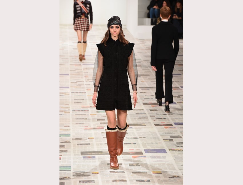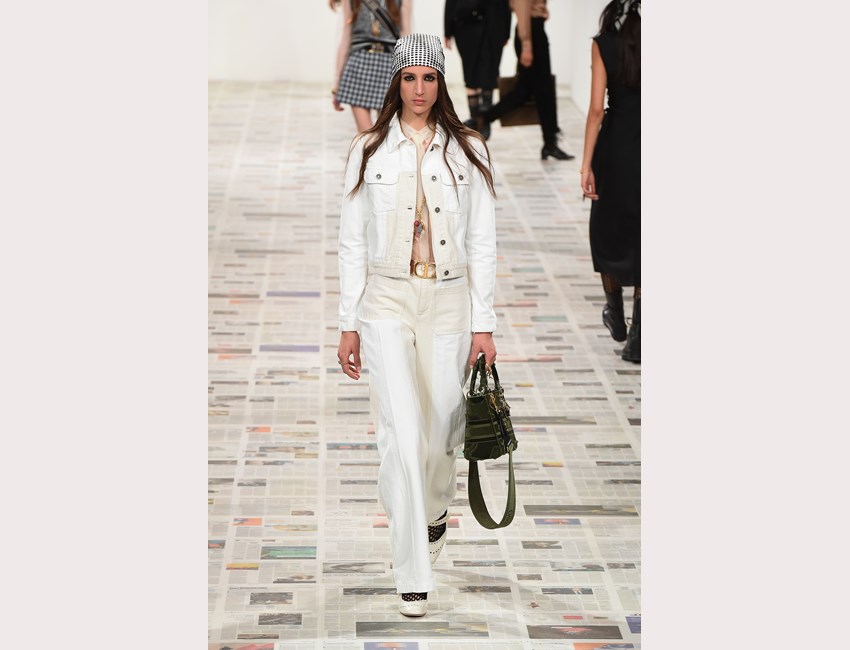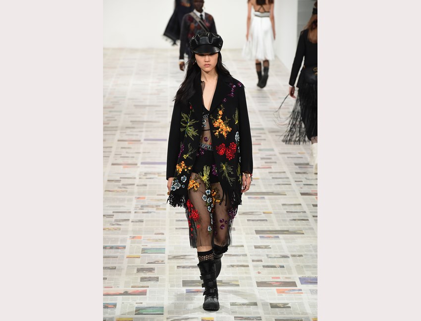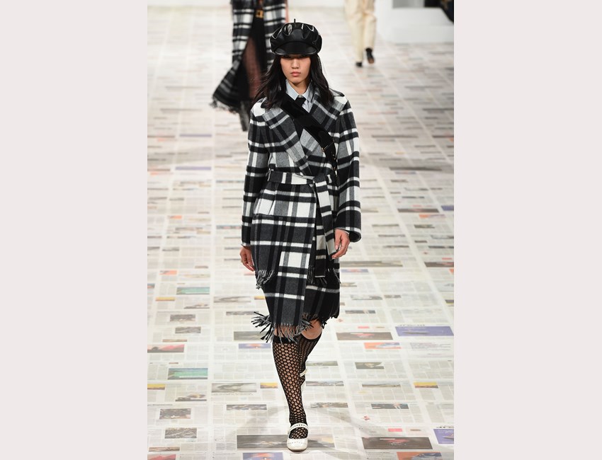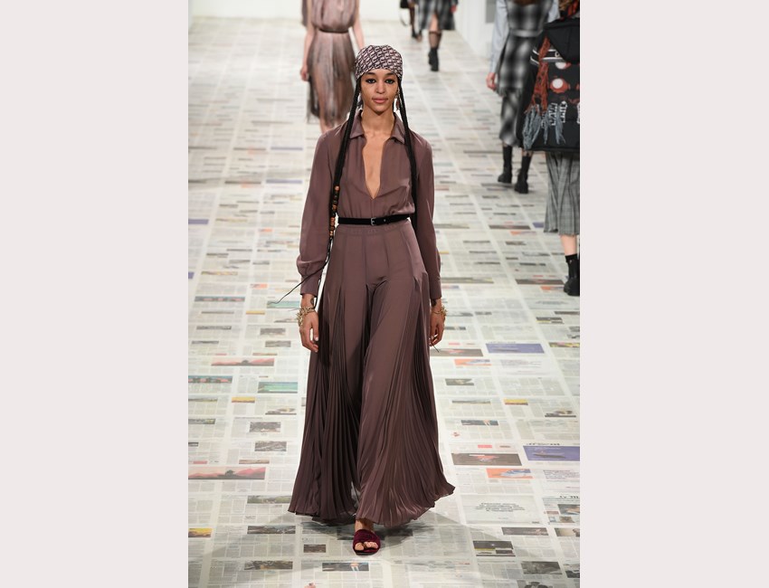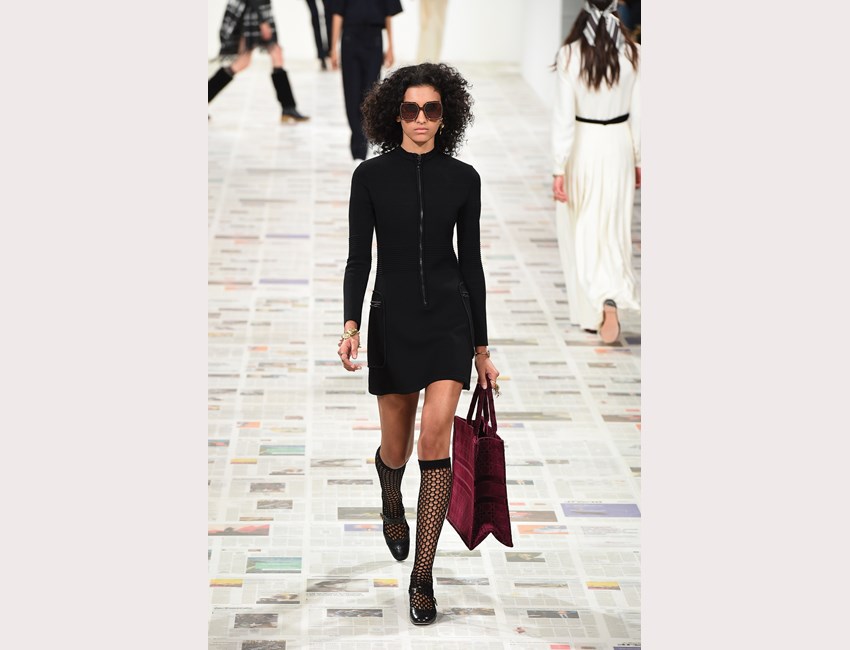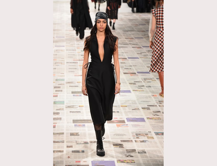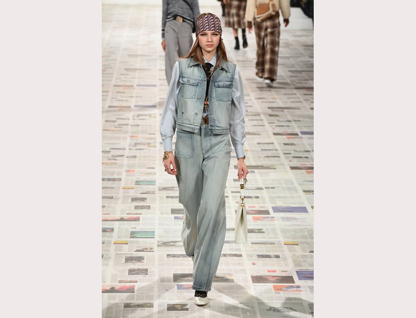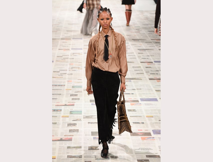 Το show της αυτή τη φορά ξεκίνησε με ένα μαύρο pantsuit το οποίο δεν είχε ένα οποιοδήποτε σακάκι, αλλά το iconic Bar jacket του οίκου, ένα από τα κομμάτια που δημιουργήθηκε το 1947 και είναι η εξέλιξη του New Look. Είναι το κομμάτι που συμβολίζει την άνθιση του prêt-à-porter και που αγαπάει ιδιαίτερα η Chiuri. Την ίδια εποχή, ο Dior παρουσίασε και τη ski line, στοιχείο που επίσης χρησιμοποιήσε η Chiuri αυτή τη φορά, καθώς γέμισε την πασαρέλα με puffers, blanket jackets και ολόσωμες φόρμες –με τη δερμάτινη να ξεχωρίζει να δηλώνει ακόμα πιο έντονα το σύγχρονο power dressing. Παράλληλα σε πολλά από τα looks υπήρχε και ένα έντονο νεανικό στοιχείο, καθώς θύμιζαν μοντέρνα school girls και περιλάμβαναν στοιχεία όπως το καλσόν δίχτυ και οι εξαιρετικά δημοφιλείς πλέον combat boots, που η ενήλικη γκαρνταρόμπα δανείζεται από αυτή των εφήβων με την πιο relaxed και επαναστατική διάθεση.
