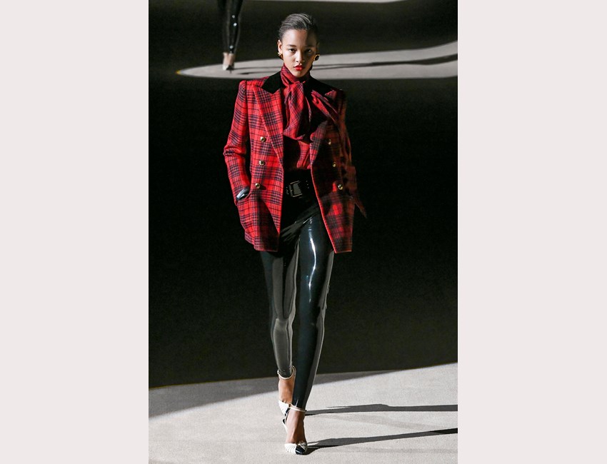 Η πάρτι διάθεση του Vaccarello αυτή τη φορά δεν μεταφράστηκε σε mini dresses αλλά και bodies από δαντέλα, μετάξι και βελούδο, όλα με μια αισθητική που θύμιζε έντονα τα 80s. Το πιο ενδιαφέρον στοιχείο όμως ήταν η έντονη αντίθεση που υπήρχε στα περισσότερα looks. Το πάνω μέρος είχε μια έντονα bourgeois αισθητική και θα ικανοποιούσε πλήρως ακόμα και την πιο συντηρητική γυναίκα, αλλά το κάτω, αντίθετα, με το λάτεξ, ήταν προκλητικά σέξι, τόσο που ακόμα και τα πιο τολμηρά party girls ενδεχομένως να δίσταζαν να το επιλέξουν. Πολλές φορές άλλωστε το skin baring ρούχο είναι λιγότερο προκλητικό από το figure hugging. Έτσι η εμμονή του Vaccarello με τα πόδια αυτή τη φορά μεταφράστηκε σε μια BDSM αισθητική, που εκτός από τα προκλητικά κολάν-παντελόνια, είχε και φορέματα και ζώνες και έντονη λάμψη.