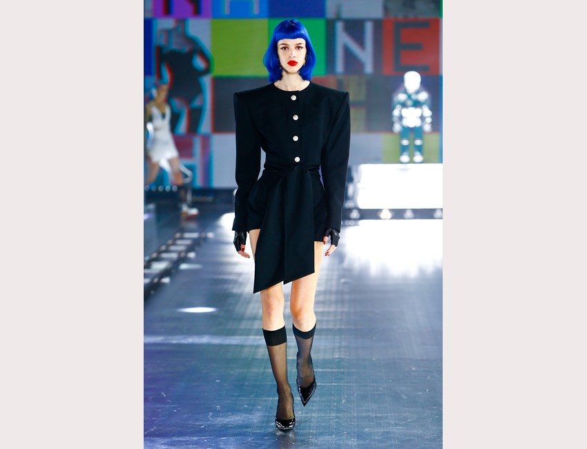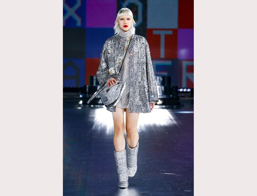 Οι μεταλλικές υφές σε ρούχα που εφαρμόζουν απόλυτα στο σώμα, με μακριά μανίκια, ψηλό λαιμό και ασορτί τσάντα, δίνουν στις γυναίκες που τα φορούν χαρακτηριστικά που παραπέμπουν στην υψηλή τεχνολογία, μετατρέποντάς τες σε αισθησιακά ρομπότ που φέρνουν σήμερα το μέλλον με όχημα τη μόδα.