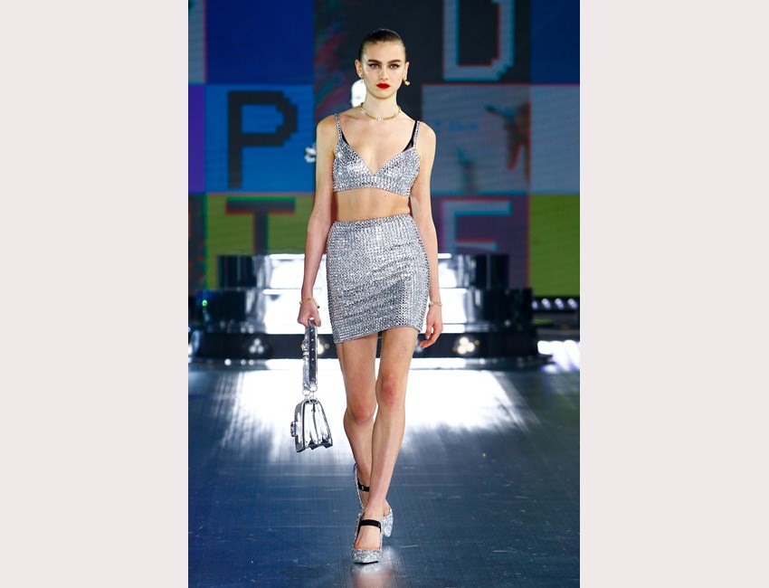 Φυσικά, δεν λείπουν τα στοιχεία από την κληρονομιά του ιταλικού οίκου αλλά και το λογότυπό του σε εμφανή σημεία, ούτε και η λατρεία στη δεκαετία του ’90 που αναδεικνύεται μέσα από τα μίνι φορέματα, τα ποδηλατικά σορτς που συνδυάζονται με μακριά σακάκια, τα εντυπωσιακά αξεσουάρ και το πανταχού παρόν lurex.