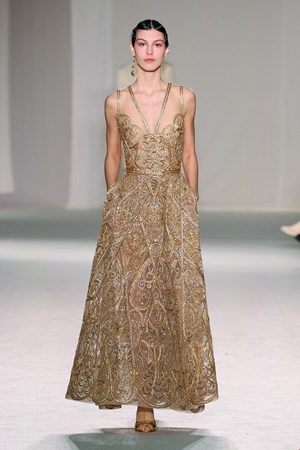 Η συλλογή του Elie Saab βασίστηκε στους δύο πυλώνες που χαρακτηρίζουν τον οίκο. Την κομψότητα και το glamour. Για την άνοιξη και το καλοκαίρι του 2023, ο σχεδιαστής δημιούργησε χρυσά φορέματα με δαντέλα και κεντήματα, που θα θέλαμε να δούμε στο κόκκινο χαλί.