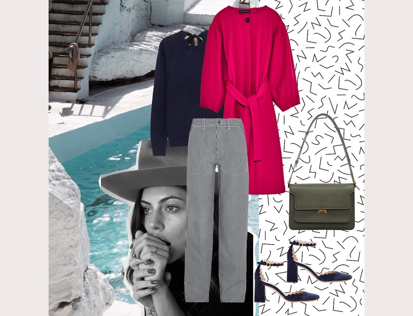 Παλτό ZARA. Πουλόβερ Joseph, NET-A-PORTER.COM. Παντελόνι Chloé, LUISA. Τσάντα Marni, SSENSE.COM. Παπούτσια Chloé, LUISA.