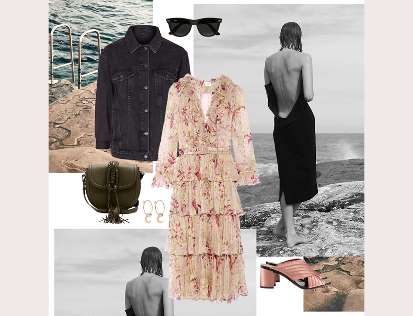 Denim jacket Topshop, TOPSHOP.COM. Φόρεμα Zimmermann, ΝΕΤ-Α-PORTER.COM. Τσάντα ώμου Altuzarra, MATCHESFASHION.COM. Μules PEDRO GARCIA. Σκουλαρίκια IAM by Ileana Makri, NET-A-PORTER.COM. Γυαλιά ηλίου Ray-Ban, LUXOTTICA HELLAS.