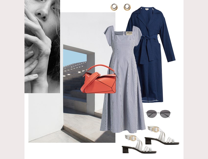 Πανωφόρι Isa Arfen, MATCHESFASHION.COM. Φόρεμα A.W.A.K.E., ΜΑΤCHESFASHION.COM. Τσάντα Loewe, NET-A-PORTER.COM. Σανδάλια MANGO. Γυαλιά ηλίου Elizabeth and James, NET-A-PORTER.COM. Σκουλαρίκια Alexander Wang, SSENSE.COM.
