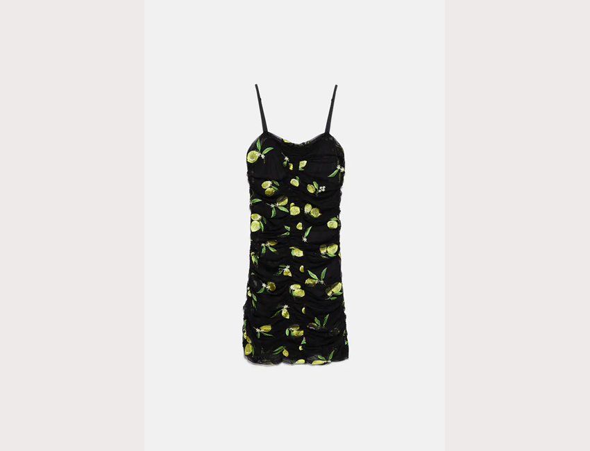 Κοντό φόρεμα με κεντημένα λεμόνια 15,99 ευρώ, zara.com